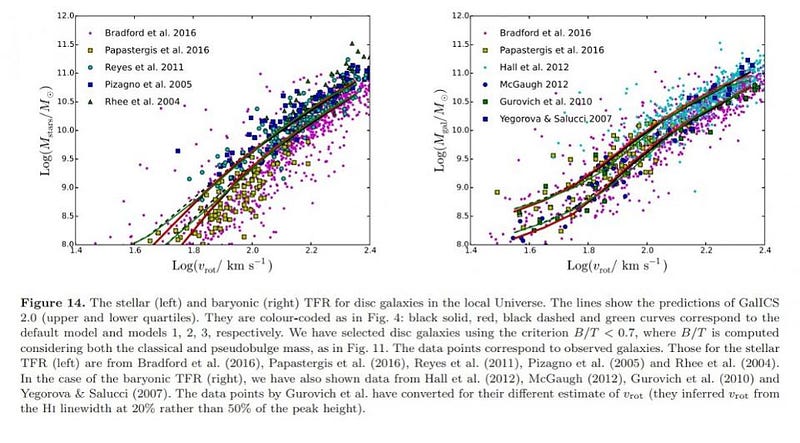 The relationship between luminosity and rotational velocity for spiral galaxies, for both stars (left) and total normal matter (right). Simulation curves by the team are shown in solid lines, with data for individual galaxies indicated as points. This agreement is unprecedented. Image credit: A. Cattaneo et al., arXiv:1706.07106, submitted to MNRAS.