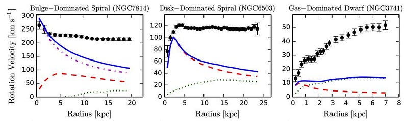 The observed curves (black points) along with the total normal matter (blue curve) and various components of stars and gas that contribute to the rotation curves of galaxies. Image credit: The Radial Acceleration Relation in Rotationally Supported Galaxies, Stacy McGaugh, Federico Lelli and Jim Schombert, 2016.