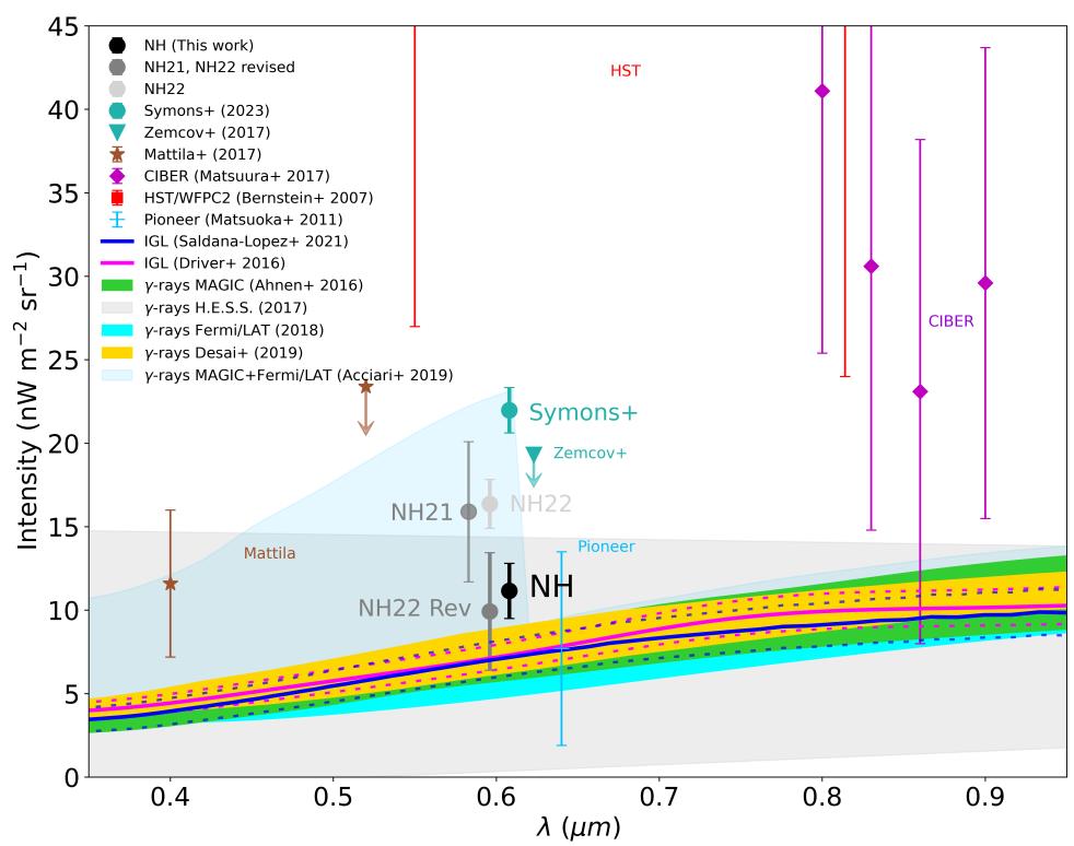 That study, based on seven fields that were acquired back when New Horizons was closer to the Sun (42 to 45 AU away), they inferred a cosmic optical background intensity of 15.9 ± 4.2 nanowatts per square meter per steradian (where a steradian is a measure of solid angle on the sky; there are a total of 4π steradians across the entire sky), which was approximately double the amount of light expected from unresolved stars and galaxies. It seemed that the data was pointing to a surprise: perhaps there was more light out there in the Universe than the known and anticipated stars and galaxies could account for.