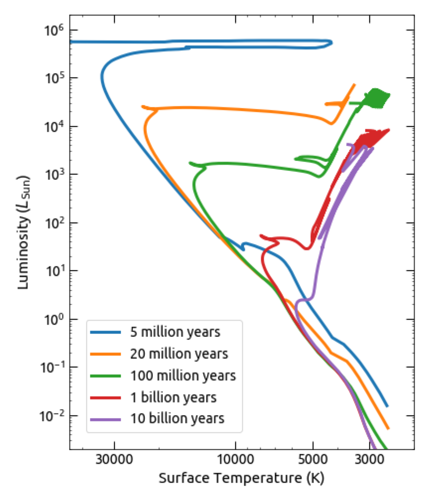 Mass is also the primary determinant of a star’s lifetime, meaning that as the stars in a cluster all age, it’s the most massive ones that run out of fuel in their core first. As these clusters age, the most massive stars evolve off of this snake-like line first. Therefore, if we can identify the “turn-off” point of a cluster, we can determine its age to a rather high precision.