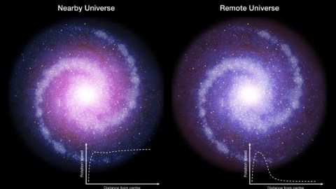 In a new paper published in Nature, lead author Reinhard Genzel claims to have discovered exactly that. By examining six independent, bright galaxies, Genzel claims to have discovered exactly this effect: more distant galaxies rotate more slowly at their outskirts than in their center. It would seem that dark matter has scored a major victory!