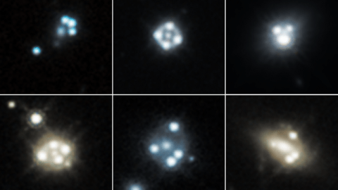 Six of the quadruply lensed systems used to place the best model-independent constraints on dark matter’s temperature/mass from structure formation alone. This method involved no dependence on the interaction between normal matter and dark matter. (NASA, ESA, A. NIERENBERG (JPL), AND T. TREU AND D. GILMAN (UCLA))