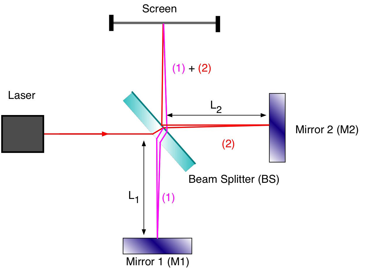 Instead, Michelson realized that if he made the path length of both light paths identical, then he could send one down a direction that was oriented at 90° relative to the other one. As they reached the end of the line, he could set up a mirror at the end of the apparatus, and that mirror would reflect the light back toward their original location. When those two separate beams of light arrived at their point of origin, they should arrive simultaneously, assuming they covered the same amount of distance in the same amount of time. However, when the two light paths came back together, he could recombine them to see if there was even a tiny shift, which would produce an interference pattern.