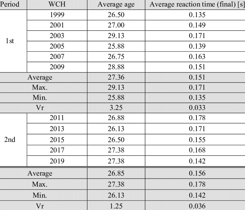 This table shows the average age and reaction times of finalists at 100 meter events in the Women’s World Athletics Championships from 1999 through 2019. Although there is substantial variation in reaction times, reacting faster than 0.1 seconds always results in a false start.