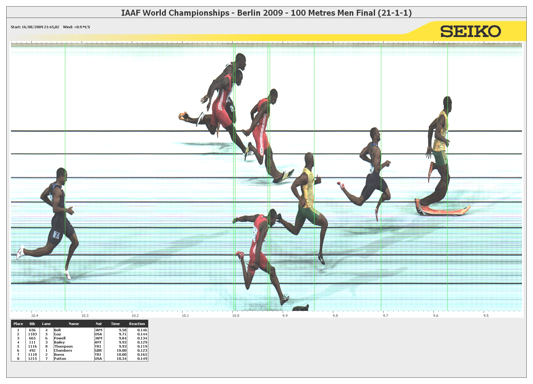 and sustaining a 17.9 m/s speed for the race’s remainder (4.31 s),