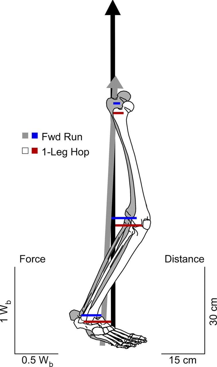 The anatomy of a human leg under tension for running (blue) and hopping (red) gaits. Human legs achieve maximum forces of 800-1000 pounds while running, and up to 30% greater while hopping. Beyond ~1300 pounds of force, human bones will break.
