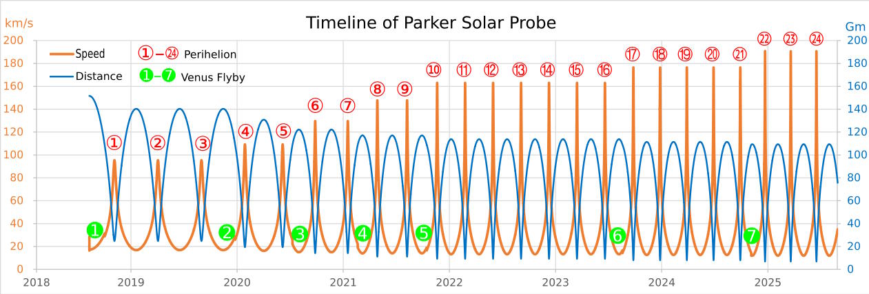 This graph shows the speed of the Parker Solar Probe and its distance, both with respect to the Sun. Its various perihelia and Venus flybys are shown in red and green numbered points, respectively. It is unknown whether the Parker Solar Probe will survive beyond its 24th perihelion pass.