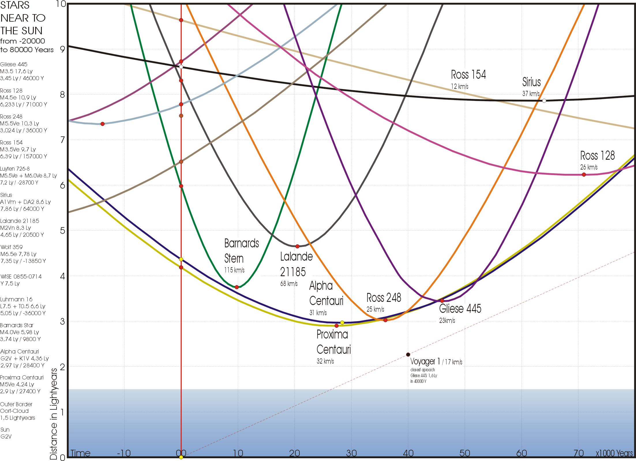 For example, today, the Alpha Centauri system is the closest to us at ~4.3 light-years away, but it’s not even at its closest. In another 29,000 years, the system will come within ~3.1 to 3.2 light-years from us, cutting the distance we’d be required to traverse by more than 25%. And that’s not all! In the relatively recent past, some 78,000 years ago, a binary system known as Scholz’s star, which is an M-class red dwarf with a brown dwarf companion, passed within just 0.8 light-years of Earth, making it the closest star to approach us in nearly 3 million years. Things can change quickly, however, as Scholz’s star is already more than 22 light-years away!