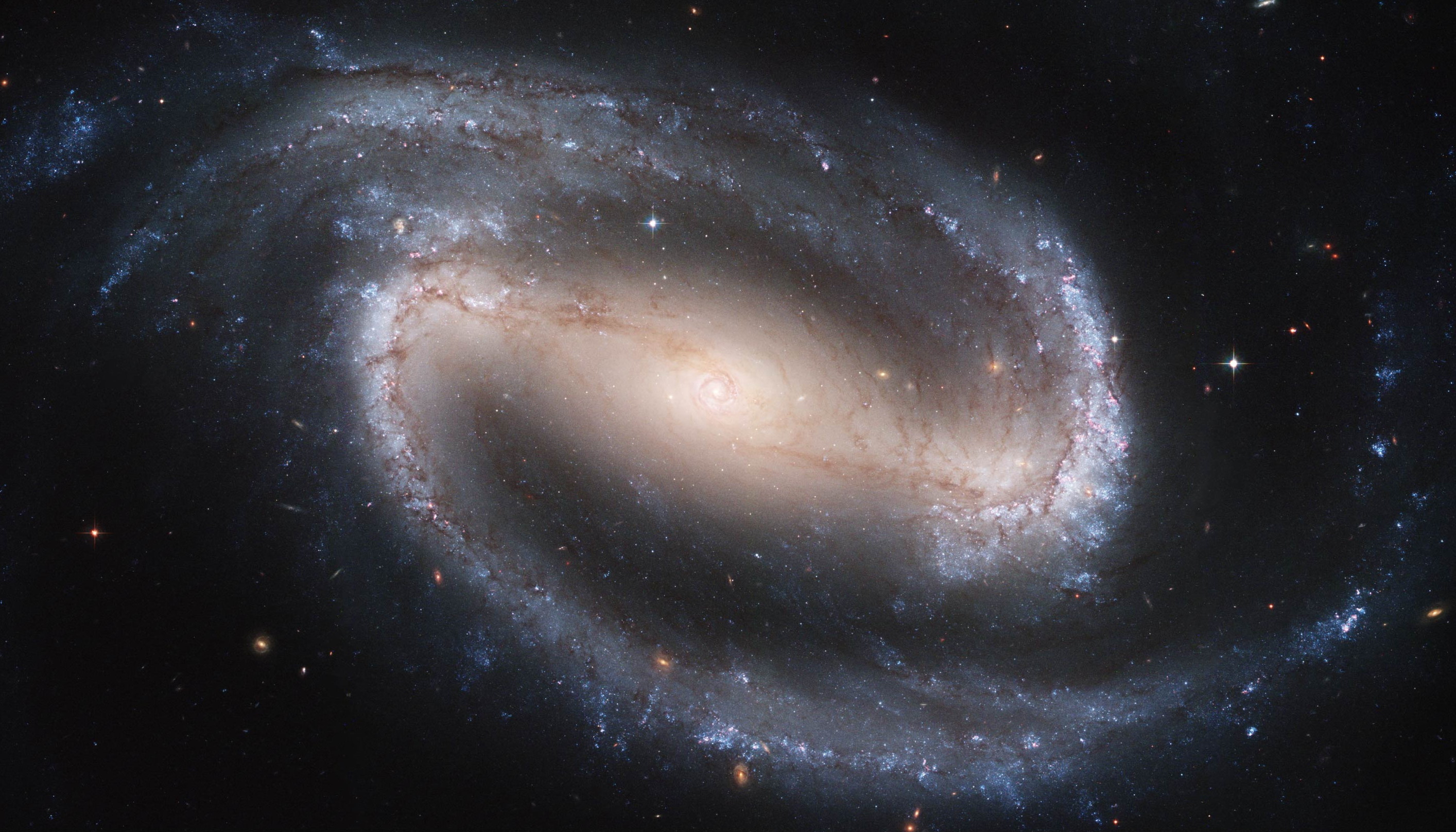 The enormous bar at the core of galaxy NGC 1300 spans many tens of thousands of light-years, nearly the full width of the galaxy. While many spiral galaxies contain large, prominent bars such as this one, our Milky Way’s central bar is far more modest, extending only about a third of the way out to the Sun’s position. The pink regions found along the spiral arms are evidence of new star formation, triggered by the interaction of internal gas and the density waves of the internal structure.