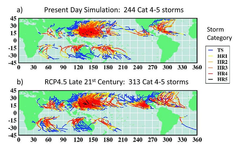 Over the same time period but given either observed early 21st century (top) or projected late 21st century (bottom) conditions, the difference in the number of intense tropical cyclones, reaching category 4 or 5 conditions, is stark. With a reasonably optimistic (RCP4.5) climate projection, we’ll still see approximately a ~30% increase in the frequency of the most severe tropical cyclones.
