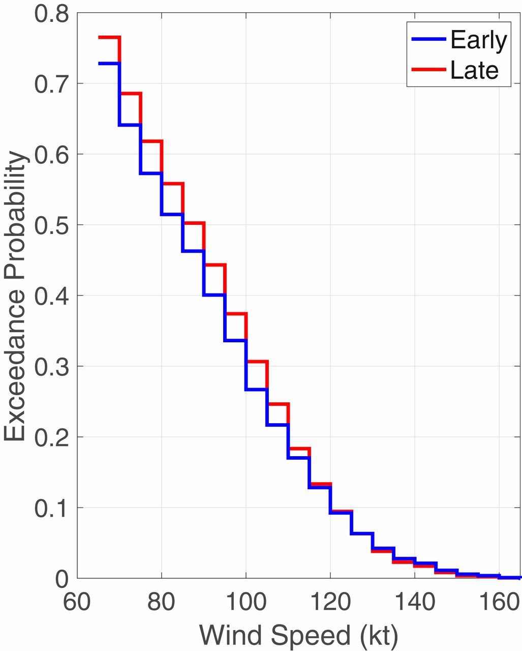The past four decades of wind speeds (x-axis) versus the probability of a tropical cyclone exceeding that wind speed (y-axis), separated by the previous 20 years (red) and the 20 years prior to that (blue). As you can see, there is strong evidence that more of these events are occurring above a certain wind-speed threshold more recently, in line with expectations of storm intensification.