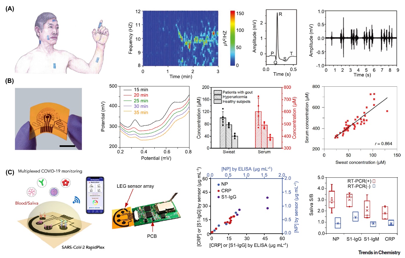 Laser engraved graphene has many wearable and telemedicine applications. Shown here are electrophysiological activity monitoring (A), a sweat-monitoring patch (B), and a rapid COVID-19 diagnosis monitor for telemedicine (C). (Credit: M. Wang, Y. Yang, and W. Gao, Trends in Chemistry, 2021)