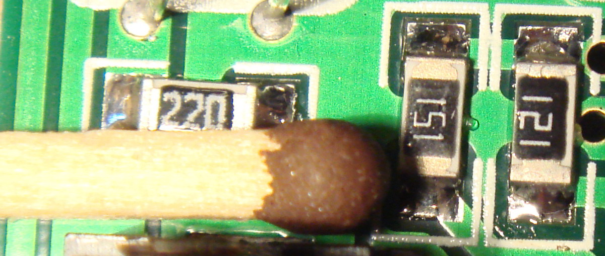 Compared to conventional resistors, SMD (surface mounted device) resistors are smaller. Shown here compared to a match head, for scale, these are the most miniaturized, effective, reliable resistors ever created. (Credit: Berserkerus at Russian Wikipedia)