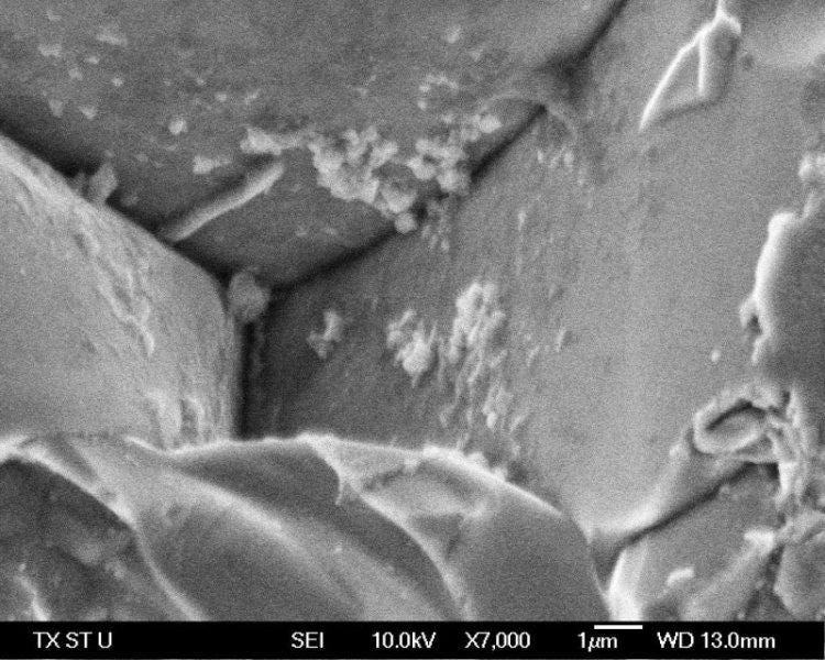 The photograph shows the large grains of a practical energy-storage material, calcium-copper-titanate (CCTO), which is one of the world’s most efficient and practical ‘supercapacitors.’ The density of the CCTO ceramic is 94 percent of the maximum theoretical density. Capacitors and resistors have been thoroughly miniaturized, but inductors lag behind. (Credit: R. K. Pandey/Texas State University)