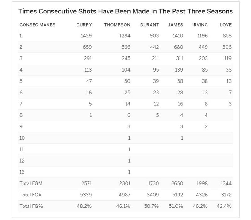 This is a stunning example of what scientists call “selection bias,” where you’ve restricted the chances of various possible outcomes just in the way you’ve obtained information about your data. There was a cognitive psychology paper published back in 1985 about the fallacy of the “hot hand” in the NBA, and their statistics showed that the hot hand was a myth. In fact, if you look at the chart above, you’ll notice that there’s a drop-off of more than 50% (in most cases, significantly more than 50%) in each player’s success rate in hitting that next tier of a long hot streak. “Myth confirmed,” you conclude.