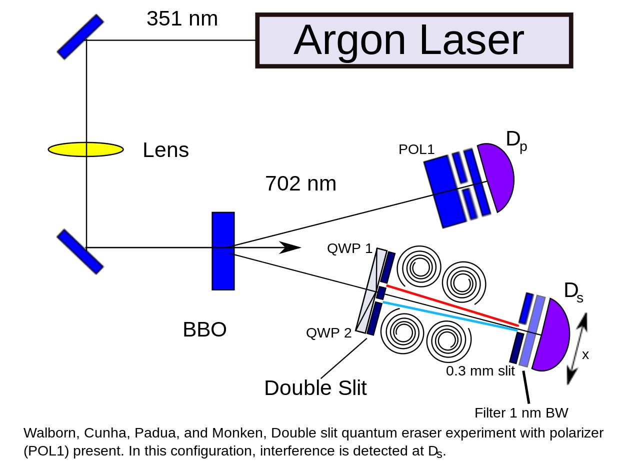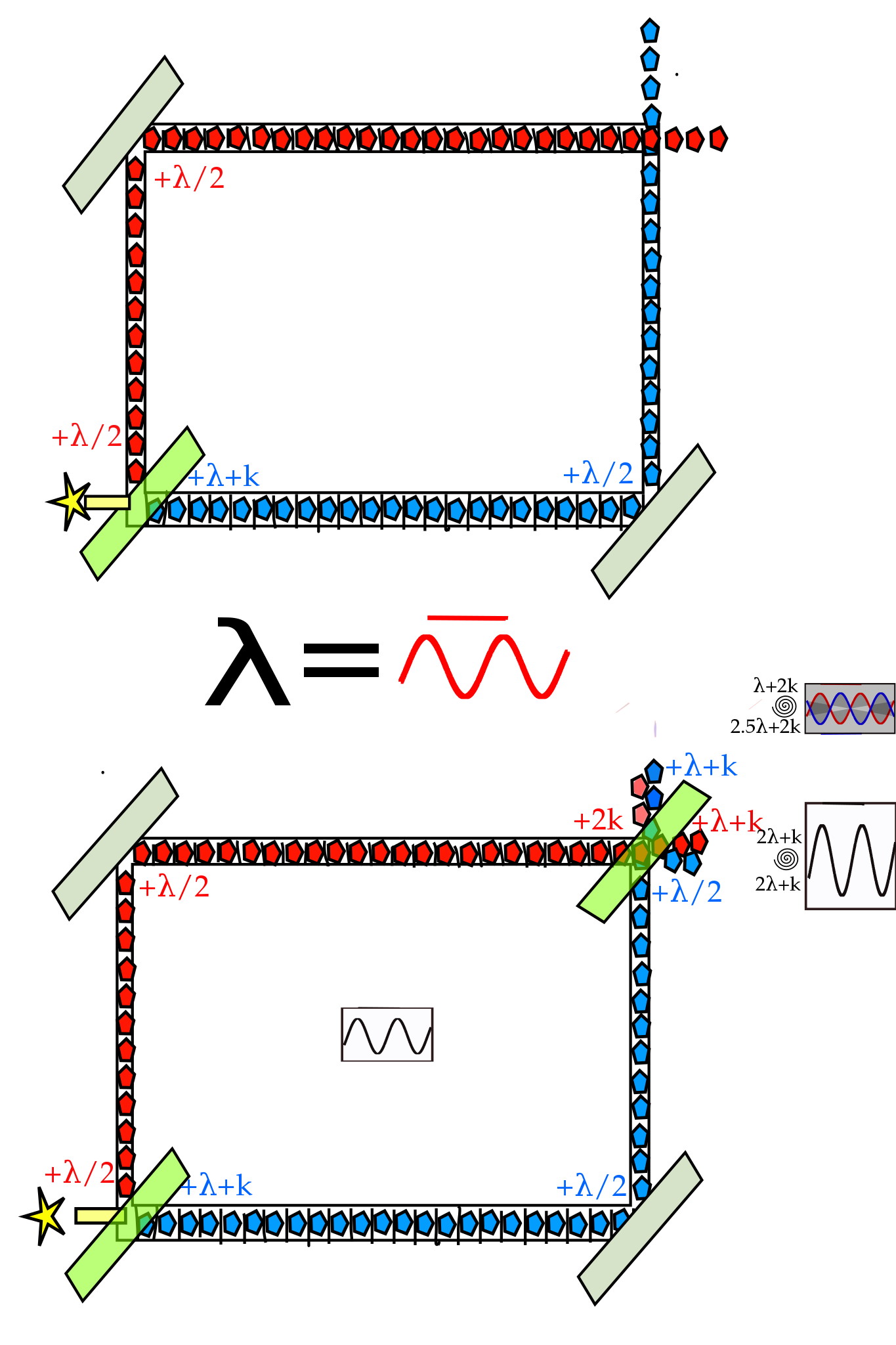 - If the configuration is “open” (as shown at the top of the above figure), you’ll simply detect the two photons individually and won’t get a recombined interference pattern, as there will be no beam splitter to recombine the beams in the final location.