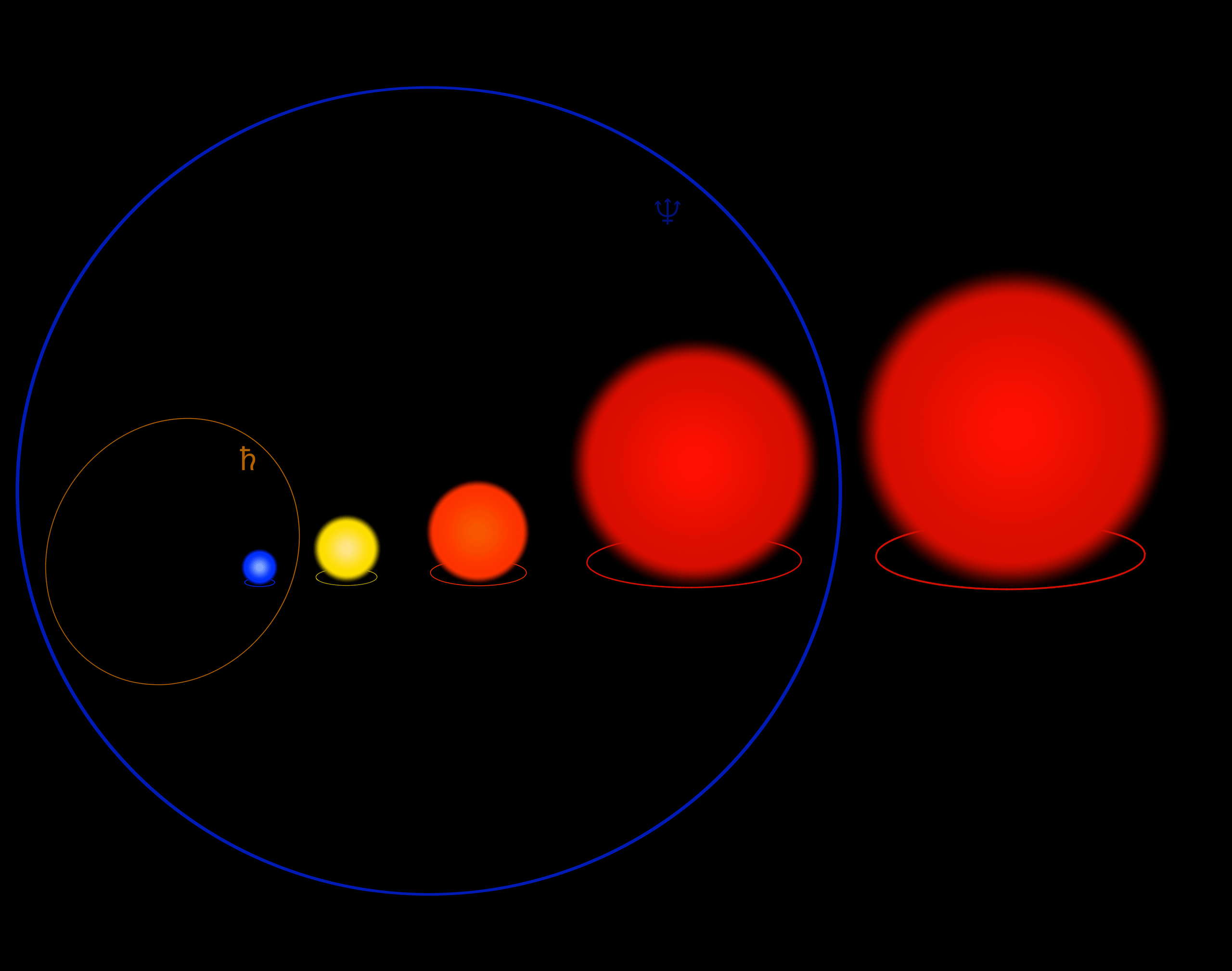 This illustration shows some of the largest stars in the Universe, along with the orbits of Saturn (brown ellipse) and Neptune (blue ellipse) for comparison. The stars, from left to right, are the largest blue hypergiant, yellow hypergiant, orange hypergiant, and then the largest two stars of all: the red hypergiants UY Scuti and Stephenson 2-18. The largest stars are approximately 2,000 times the diameter of our Sun, but the temperatures at the surfaces of these stars range from only a few thousand K all the way up to Wolf-Rayet stars, with temperatures of ~200,000 K.
