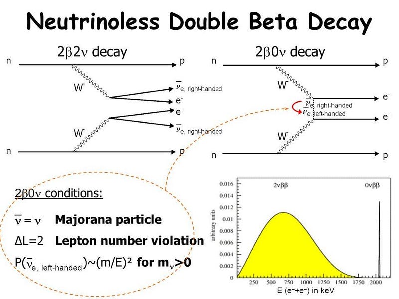 A new type of decay: neutrinoless double beta decay. The theoretical idea of a source for dark matter, dark energy, and the baryon asymmetry is fascinating, but you need an experiment to detect it. Until we can directly measure neutrinos (and anti-neutrinos) left over from the Big Bang, a feat that’s practically impossible due to the low cross-section of these low-energy neutrinos, we won’t know how to test whether neutrinos have these properties (Majorana) or not (Dirac). But if a double beta decay that emits no neutrinos occurs, we’ll know that neutrinos do have these (Majorana) properties after all, and all of this suddenly could be real.