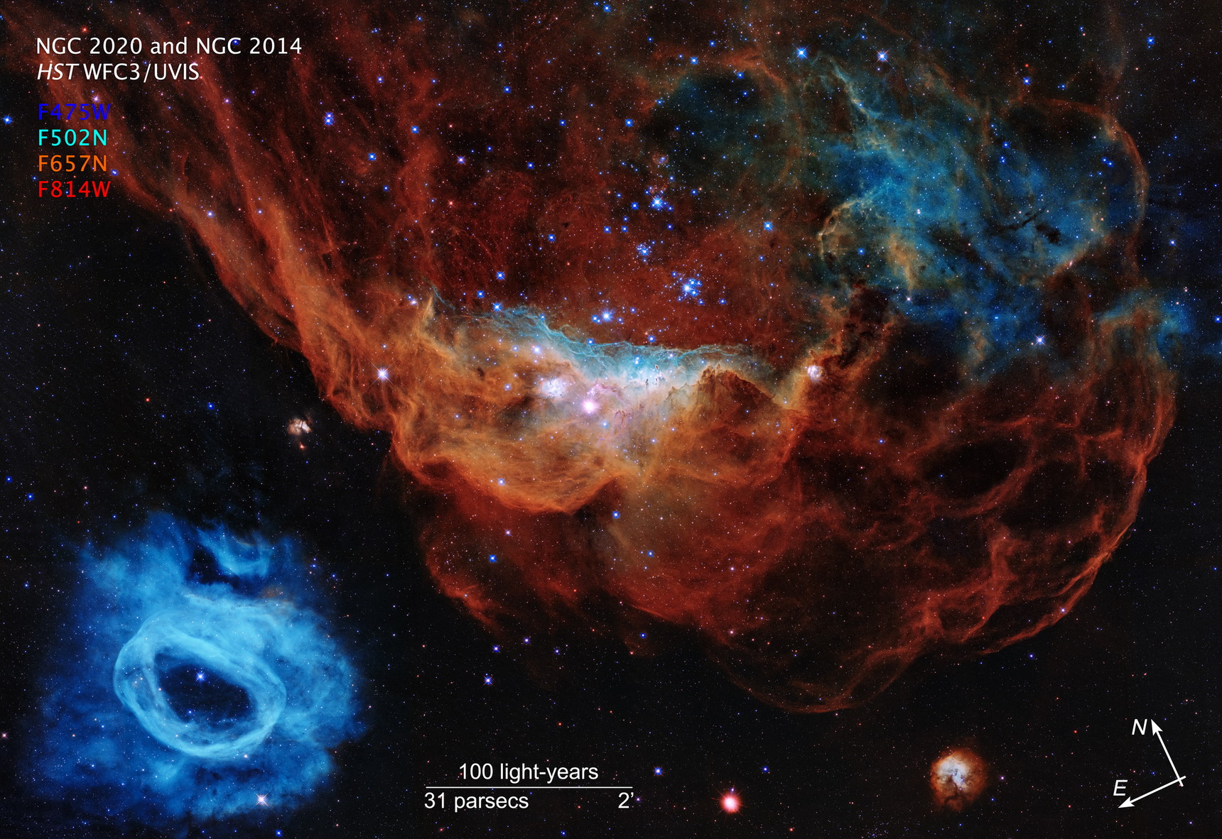This image showcases the scale of a composition created with data from the Hubble Space Telescope known as the “Cosmic Reef.” Spanning 520 light-years across, under 2% of the extent of the Large Magellanic Cloud, the large red nebula is catalogued as NGC 2014, with the smaller blue nebula known as NGC 2020.