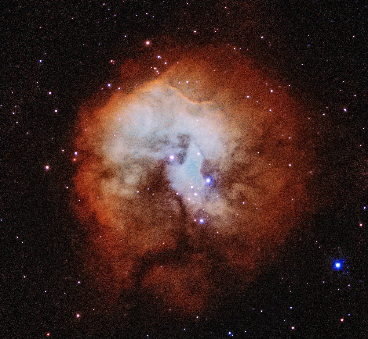 The swirling ring of gas at the center of NGC 2020 arises from material blown off from the hot Wolf-Rayet star that blew it away. The fact that the nebula and the massive, bright star shine with the same color provides an excellent hint that the reflected light from the star is what’s creating the color of the nebula.