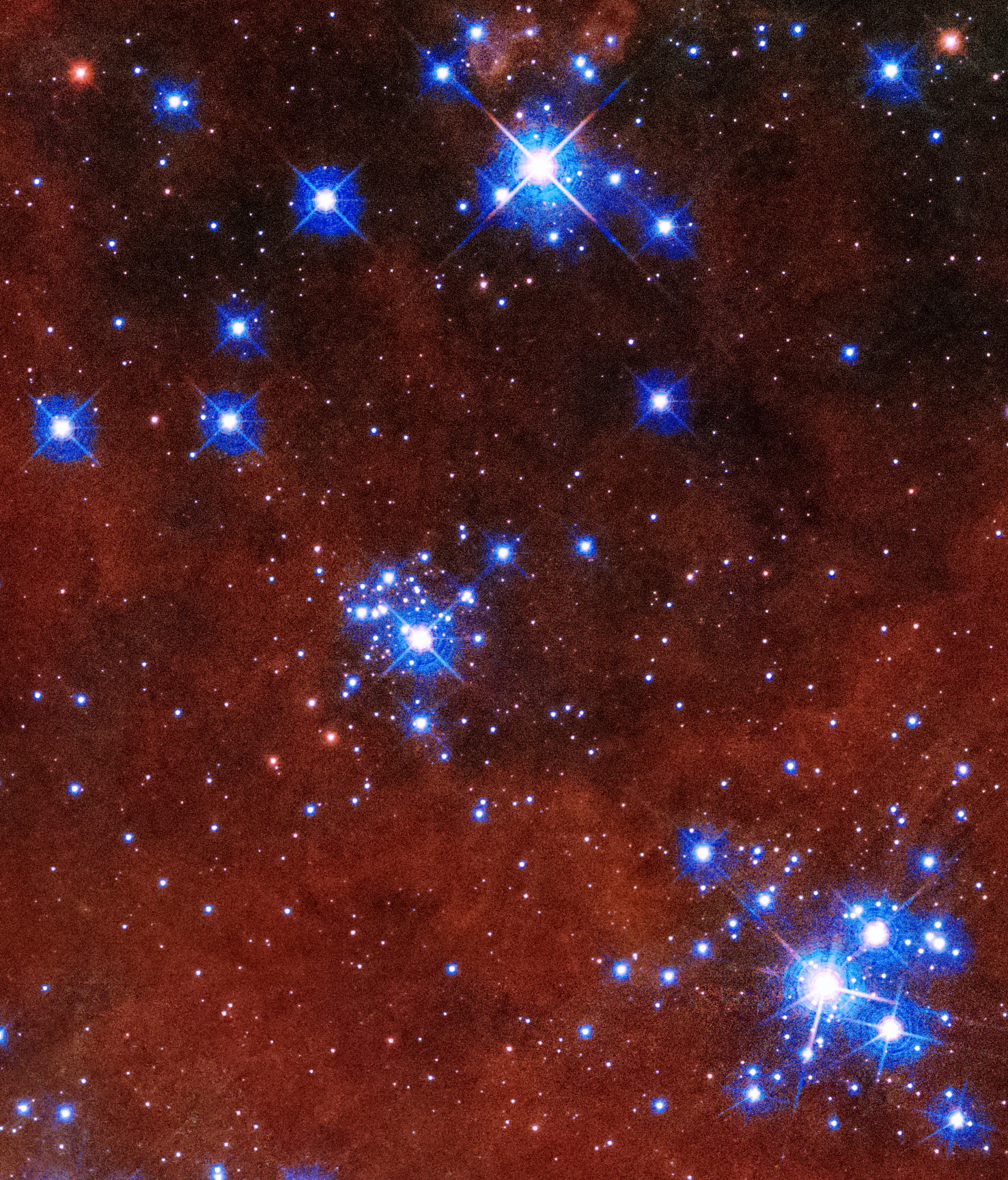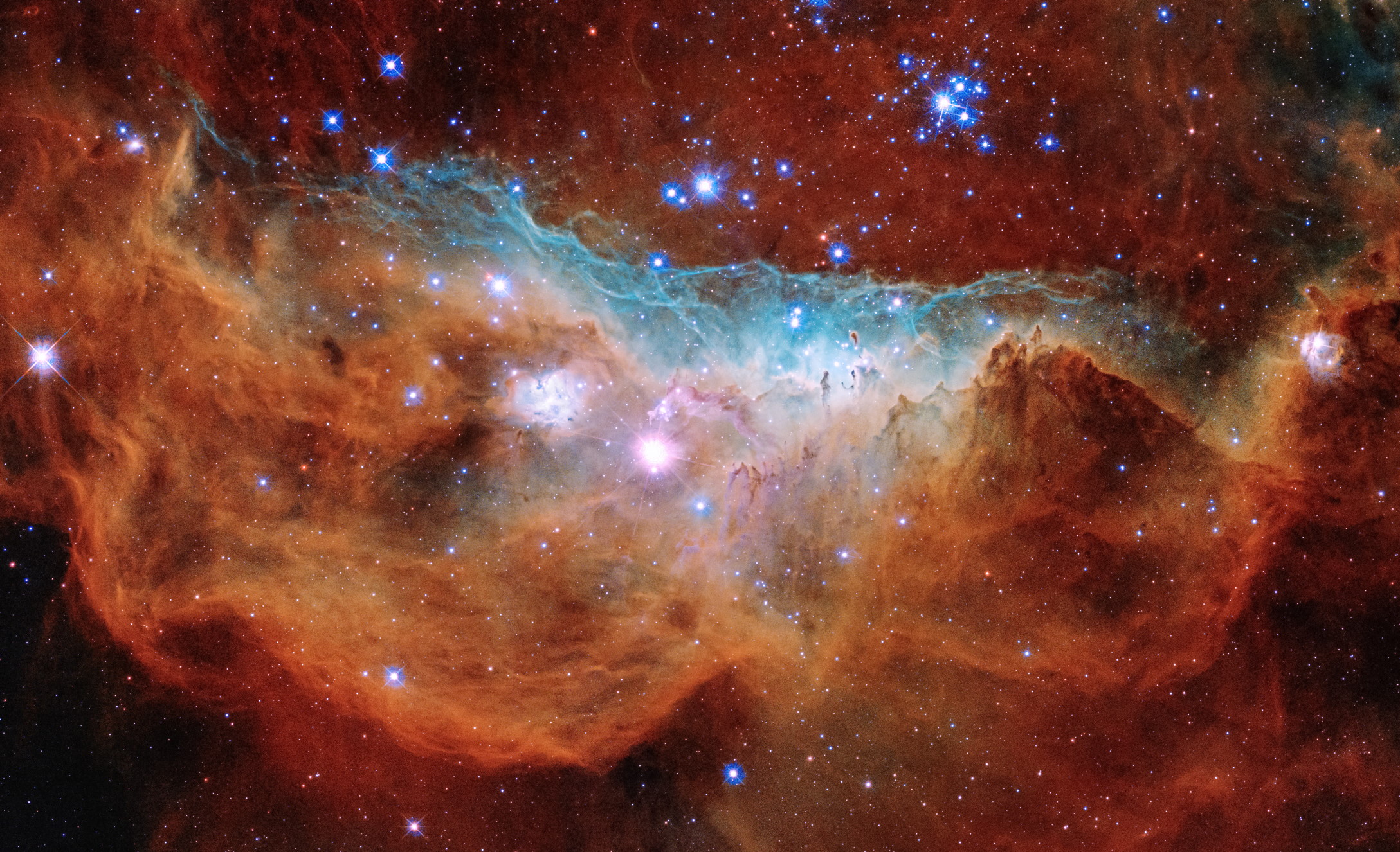 Hot, massive blue stars highlight young star clusters within the main nebula.