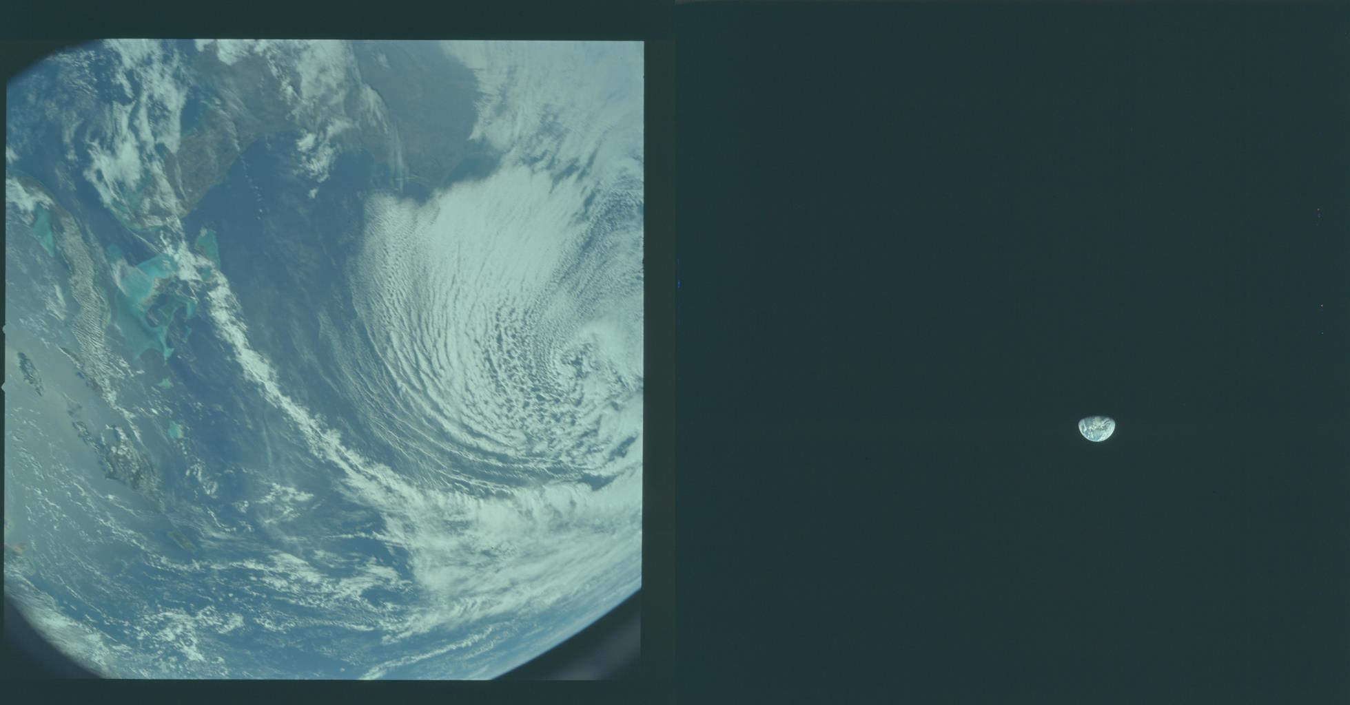 Apollo 8 astronauts were the first humans to reach great enough distances from our planet to be able to view the entire Earth at once. Here, the closest (left) and farthest (right) images of the Earth are shown as acquired with the same Hasselblad camera. Except for the three humans on board at the moment, all of humanity is confined to the pale, blue dot on the right.