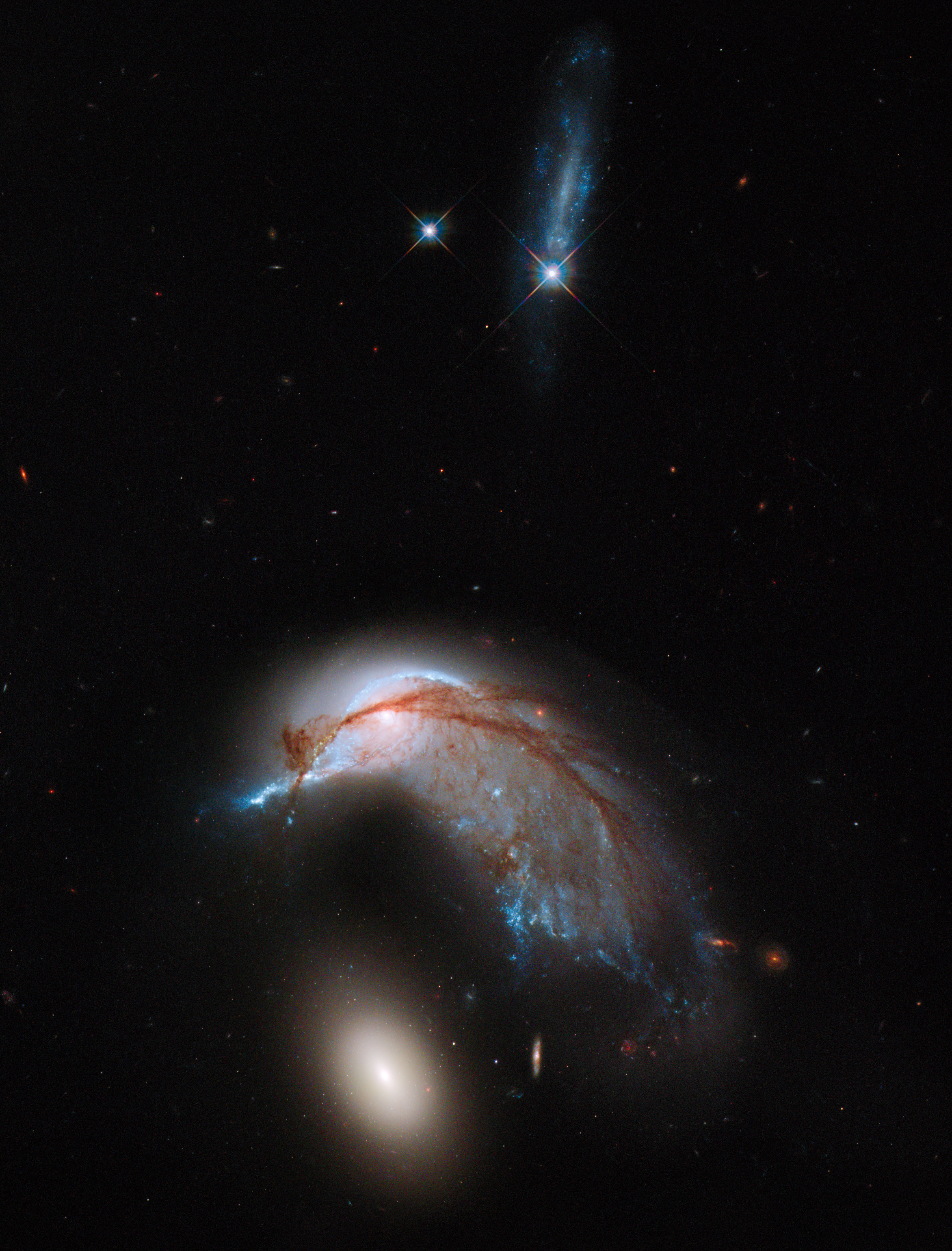 This interacting pair of galaxies, cataloged as Arp 142, was dubbed “the Penguin and the Egg” after the Hubble Space Telescope revealed this view of the two member galaxies: the extended NGC 2936 and the compact NGC 2937.