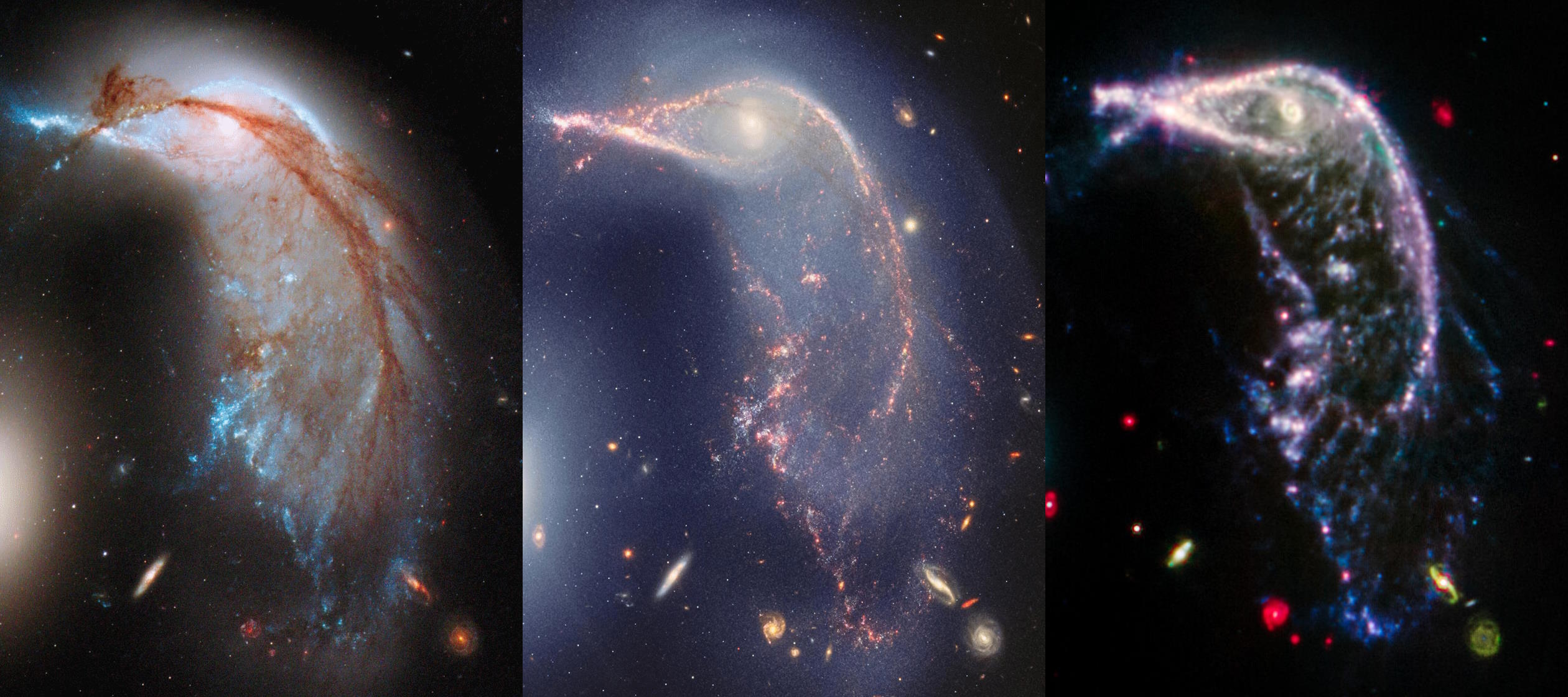 This three-panel animation shows Hubble (visible light), NIRCam (near-infrared light), and NIRCam+MIRI composite (all JWST light) images superimposed atop one another, highlighting the various features present within the Penguin component of Arp 142.