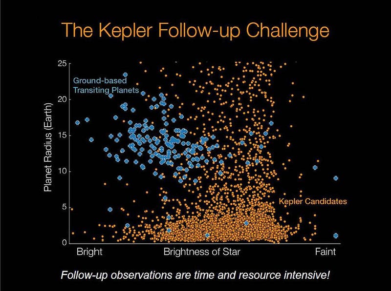 Having small, rocky worlds in the inner solar system and large, gas giants in the outer solar system isn’t the norm, as we might have expected. Gas giants and rocky planets, it turned out, could be found anywhere, with large worlds just as likely as small ones to be close to their parent stars. The planets that we were finding showed that there’s nothing forbidding gas giants from becoming “hot Jupiters,” and in fact they turned out to be quite common. But the second surprise was even more puzzling, and came thanks to the pioneering work of NASA’s Kepler space observatory. While rocky, Earth-sized worlds — and slightly larger and slightly smaller rocky worlds — were common, as were Neptune-and-Jupiter sized worlds, there was a third class of planet that was the most common of all. In between the size of Earth and Neptune lied a possibility we had overlooked: a super-Earth (or mini-Neptune) world. As it turned out, there were more super-Earths than any other type.