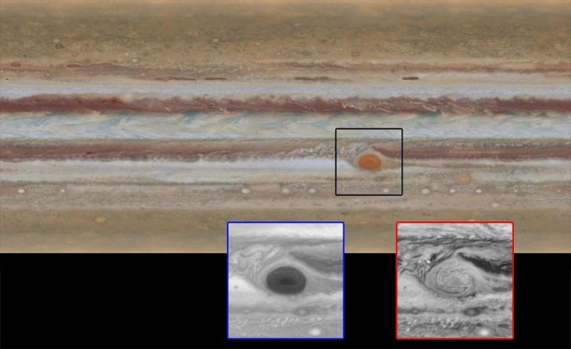 Zooming in on the Great Red Spot at blue (left) and red (right) wavelengths reveals a unique filamentary feature that had never been seen before. There is still much to learn about this spot. Image credit: NASA/ESA/Goddard/UCBerkeley/JPL-Caltech/STScI.