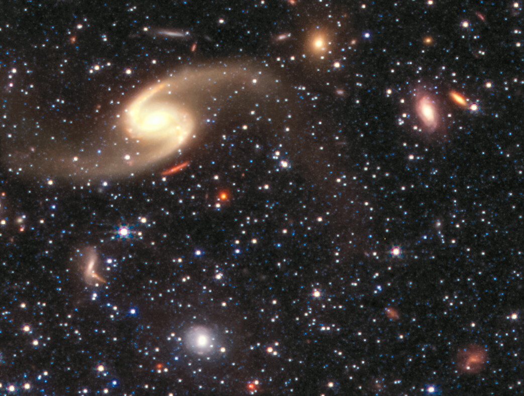 A cosmic story unfolds in a field of numerous galaxies and bright stars scattered against the dark backdrop of space, reminiscent of a scene from the Euclid mission's observations.