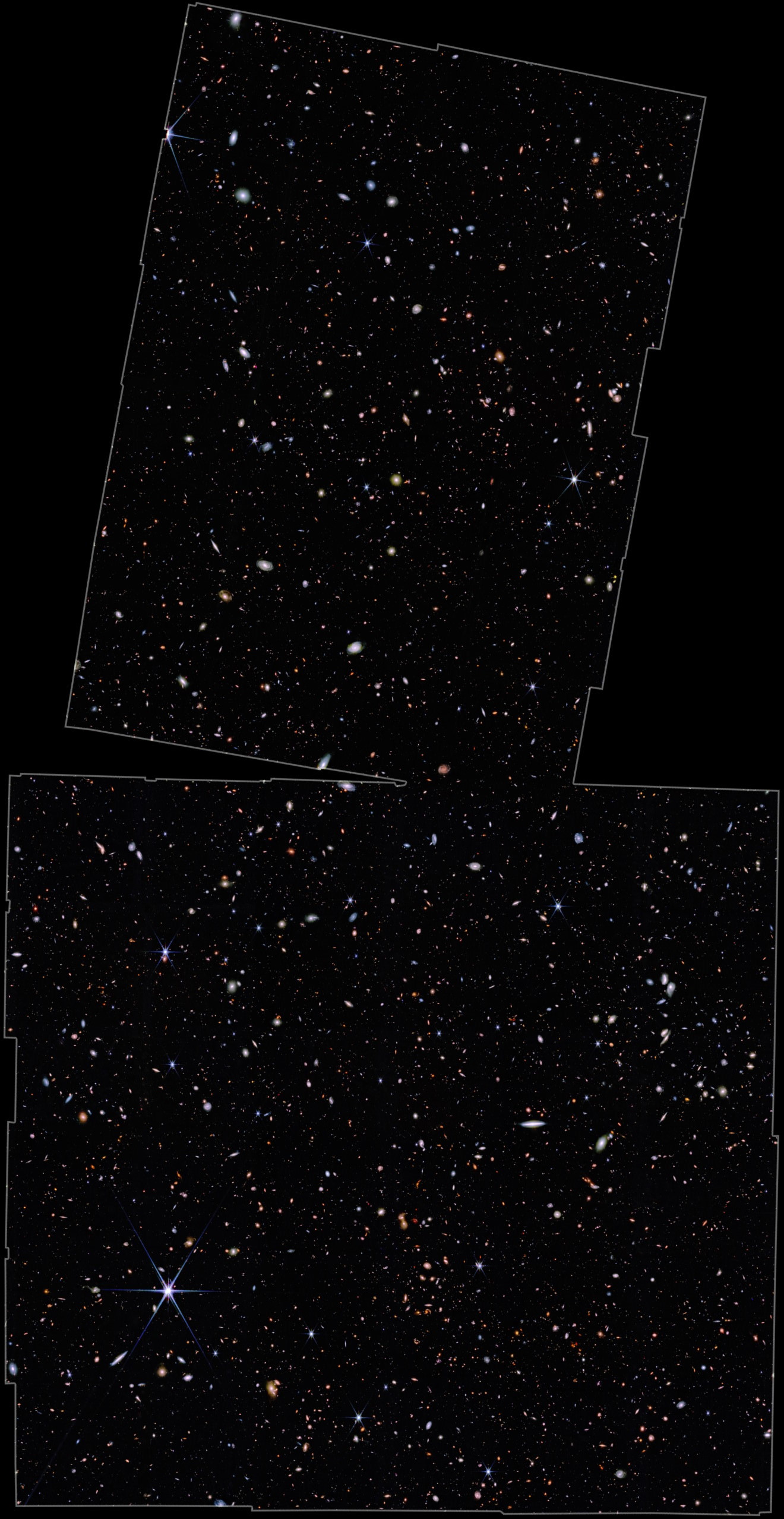 This image shows the region of study of the JWST Advanced Deep Extragalactic Survey (JADES). This area includes and contains the Hubble eXtreme Deep Field and reveals new galaxies at record-breaking distances that Hubble could not see. The colors on JWST images are not “true color” but rather are assigned based on a variety of choices. This image, released in December of 2022, has since been augmented by follow-on observations within the same region of space, with spectroscopic observations required to determine the distance to these galaxies.