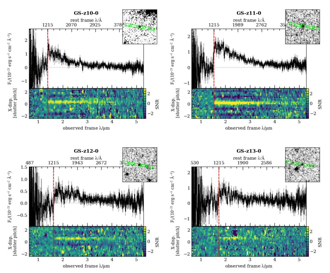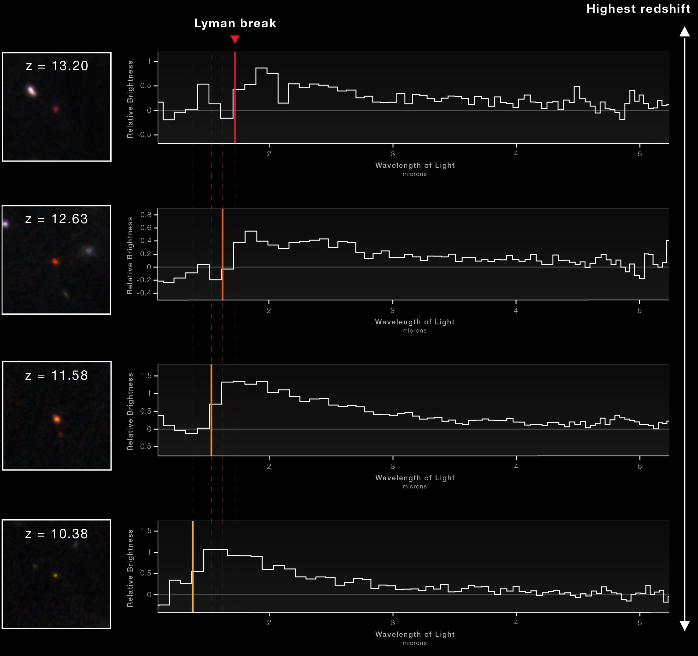 The spectroscopic identification of the Lyman break signature, present and easily visible in all four ultra-distant, JWST-identified galaxies from the JADES deep field, confirms their redshift and distance. This observation gave us, at the time, the top three most distant galaxies of all, with spectroscopic confirmation. The Lyman break feature, normally resulting in an ultraviolet photon, can be seen well into the infrared from these galaxies owing to the redshifting of the light during its journey.