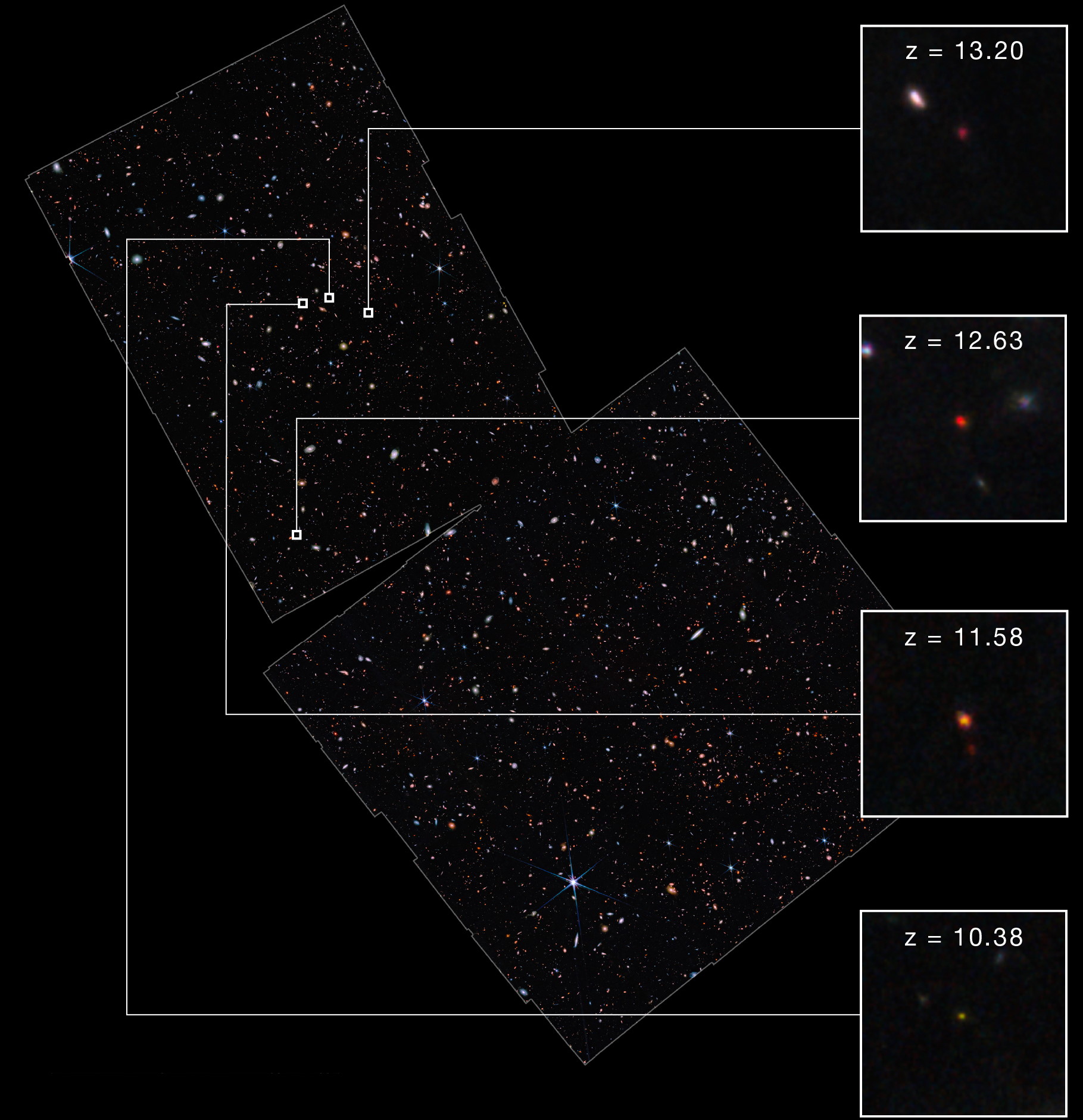 The viewing area of the JADES survey, along with the four most distant galaxies verified within this field-of-view. The three galaxies at z = 13.20, 12.63, and 11.58 are all more distant than the previous record-holder, GN-z11, which had been identified by Hubble and has now been spectroscopically confirmed by JWST to be at a redshift of z = 10.6. No doubt these records will themselves be broken, possibly with galaxy candidates that already exist within the same field-of-view.