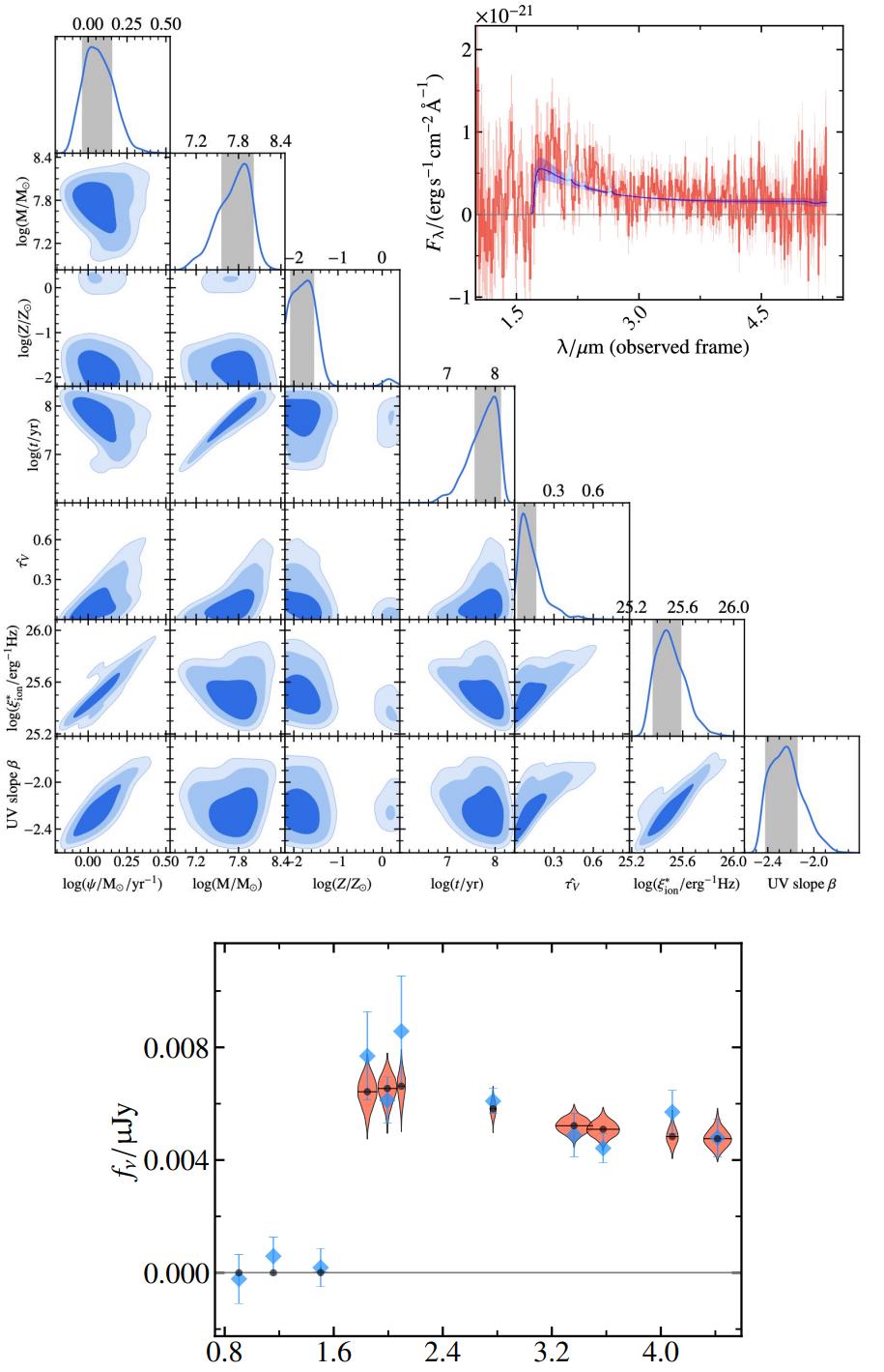 A combination of spectroscopy (top), likelihood comparisons with detailed simulations (middle), and photometry (bottom) have all been used to determine the distance to and properties of most distant galaxy JADES-GS-z13-0. Further analysis rules out other line possibilities, including carbon, oxygen, and a Balmer break, ensuring this galaxy really is sending light to us from a whopping 13.5 billion years ago.