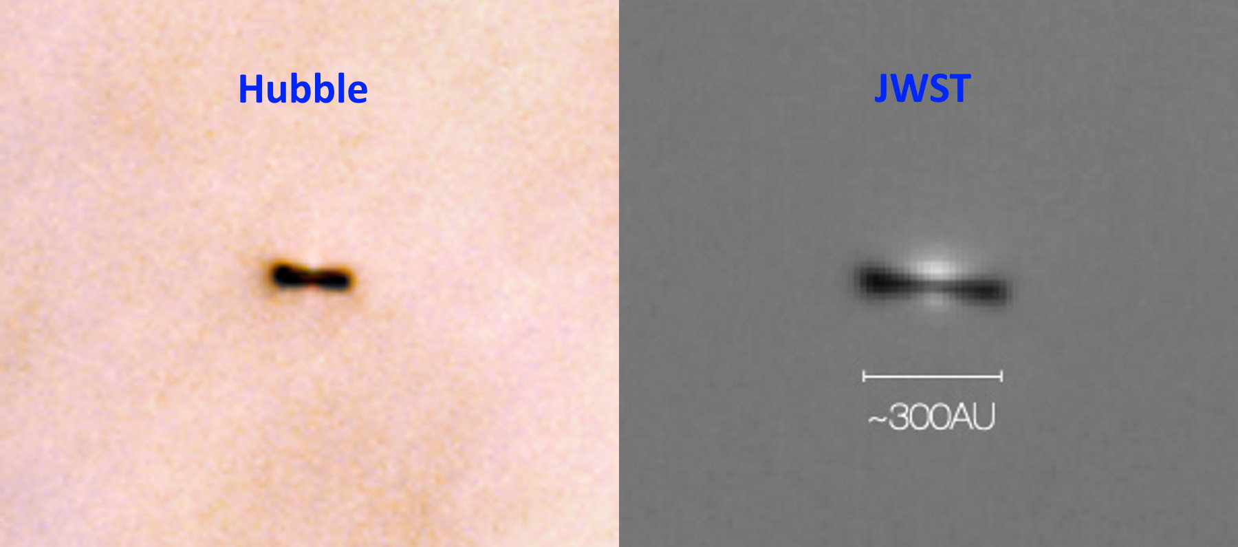 The original image of proplyd Orion 294-606 came from the Hubble Space Telescope (left); the same disk has now been imaged by the JWST (right), in higher resolution, greater detail, at longer wavelengths, and with more “bleeding” of external infrared light into the disk itself.