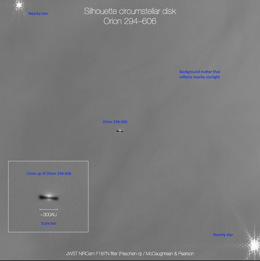 This wider-field view of the proplyd Orion 294-606 comes from the James Webb Space Telescope’s NIRCam instrument, observing at a wavelength of ~1870 nm, corresponding to a strong infrared emission/absorption line of hydrogen. The two nearest stars are only tenths of a light-year away in this flattened image, but are actually more than a light-year away each in three dimensions. The separation distances between young planet-rich systems, even within star-forming regions, can be surprisingly large.