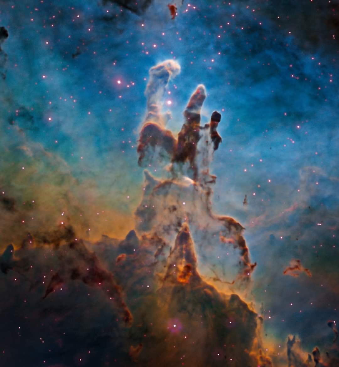 This largely unfamiliar view of the Pillars of Creation showcases the limits of the Hubble Space Telescope’s capabilities: reaching into the near-infrared to peer through the neutral matter of the pillars and into the stars forming inside. Most of the stars are background objects, behind the pillars, but a few are proto-stars currently forming inside of them. Later in 2022, the James Webb Space Telescope will view this region of space for the first time, revealing details that humanity has never seen before.