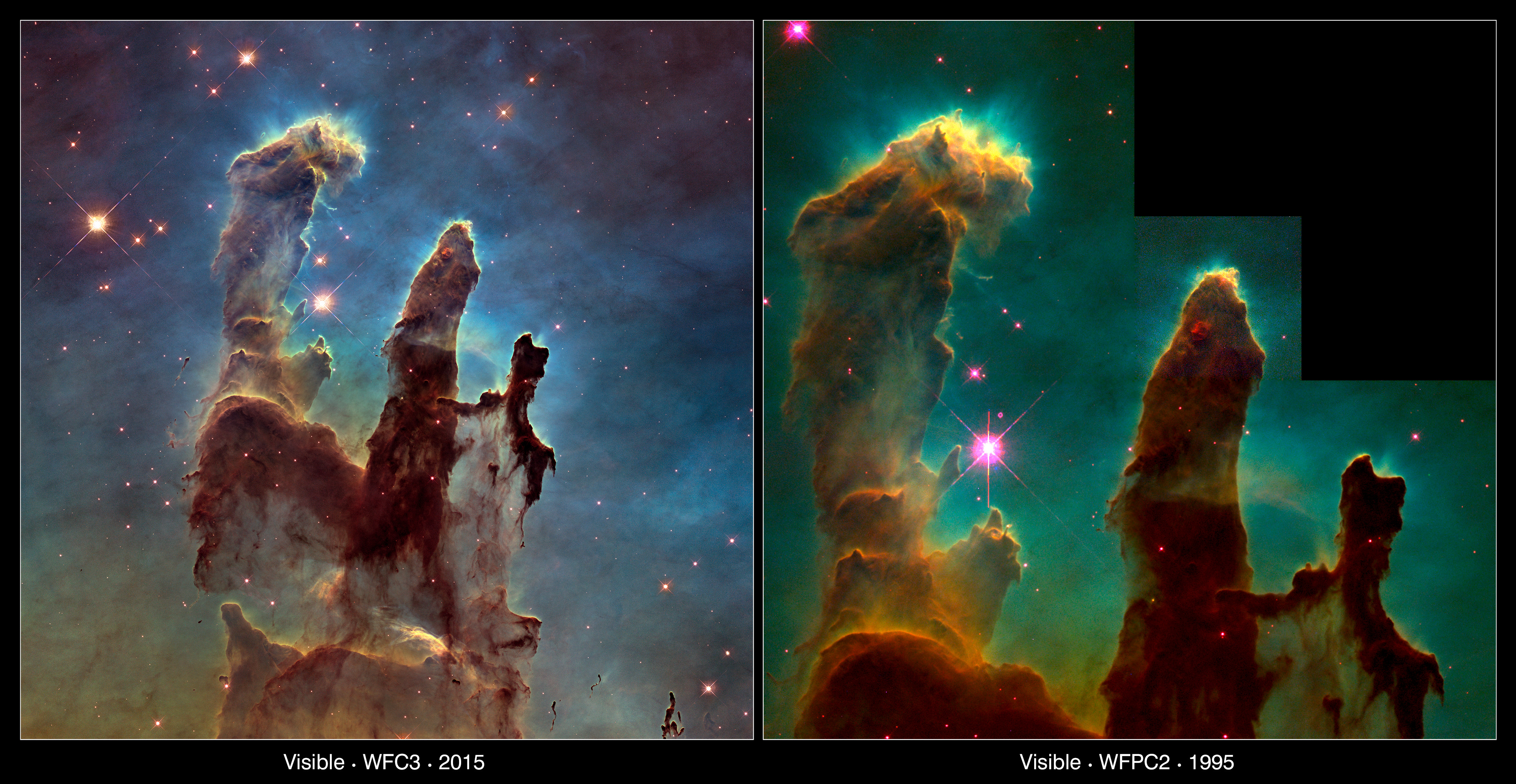 This image compares two views of the Eagle Nebula’s Pillars of Creation taken with Hubble 20 years apart. The new image, on the left, captures almost exactly the same region as in the 1995, on the right. However, the newer image uses Hubble’s Wide Field Camera 3, installed in 2009, to capture light from glowing oxygen, hydrogen, and sulphur with greater clarity, as well as with a greater field of view. The pillars are changing over time very slowly; it should take hundreds of thousands of years for evaporation to complete.