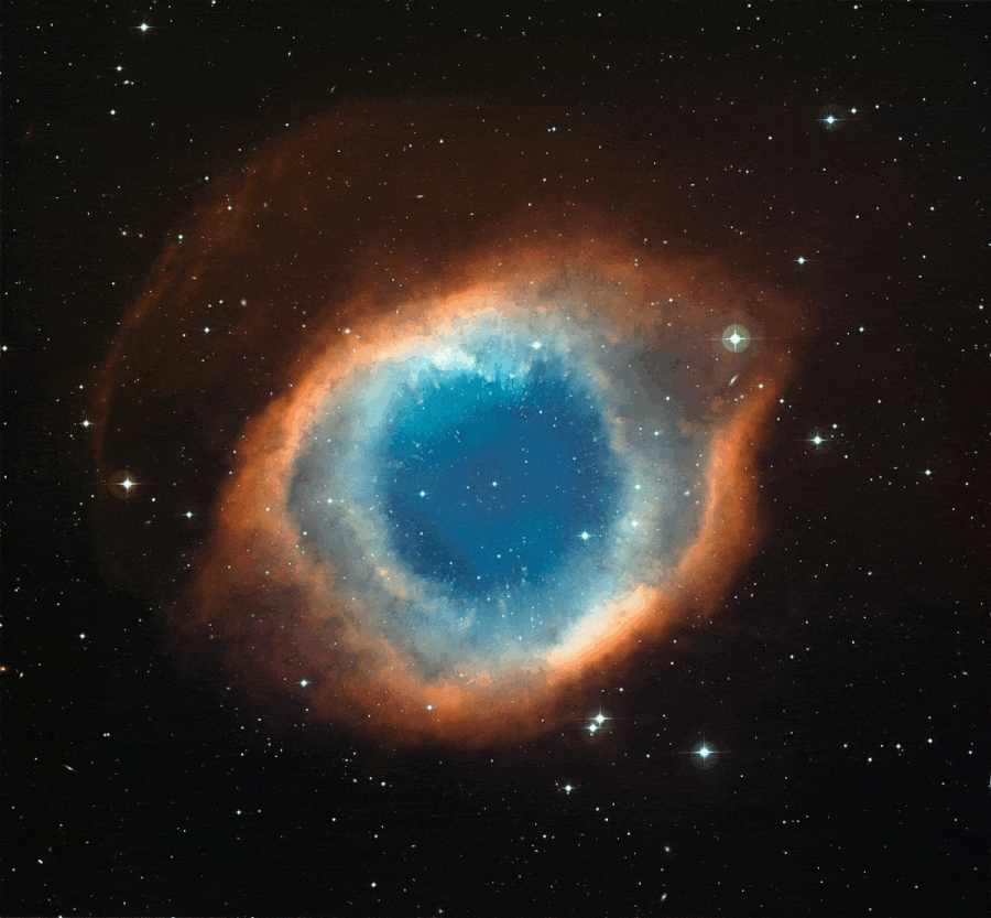 The Helix Nebula, the dying remnant of a formerly Sun-like star, reveals its gas distribution in visible light, but shows a set of obscured features that appear knotted and fragmented in infrared light. Multiwavelength views can reveal features that do not appear in only one set of wavelengths of light. Despite the space telescope-like quality of these images, they were acquired purely with ground-based facilities.
