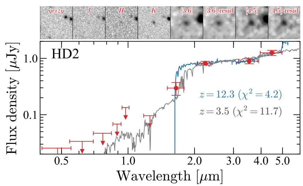 The exposures in different photometric bands (top) of candidate galaxy HD2, along with two possible spectral fits (curves) to the data points (red). Note how although a high redshift (z = 12) solution is favored over a low redshift (z = 3.5) interpretation, both are possible, and the unambiguous signature from spectroscopy is not available. In the absence of spectroscopy, this can only be labeled an ultra-distant candidate, not a robust detection.