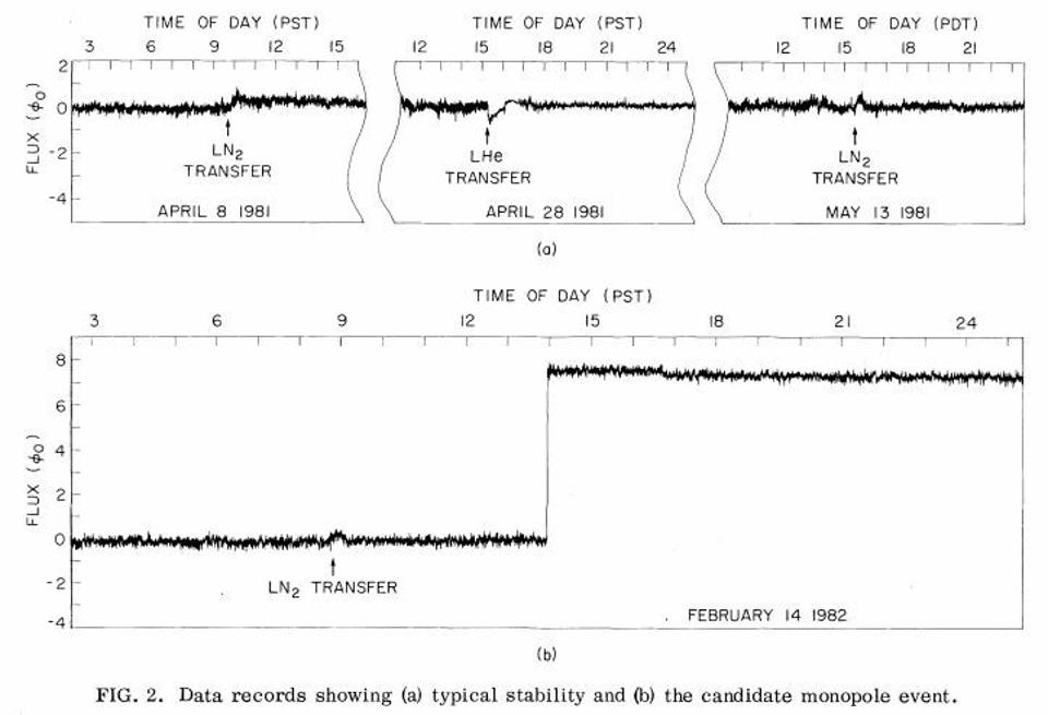 This was understood way back in 1980, and the combined interest in t’Hooft-Polyakov monopoles, grand unified theories, and the earliest models of cosmic inflation led some people to embark on a remarkable undertaking: to try and experimentally detect magnetic monopoles. In 1981, experimental physicist Blas Cabrera built a cryogenic experiment involving a coil of wire, explicitly designed to search for magnetic monopoles.