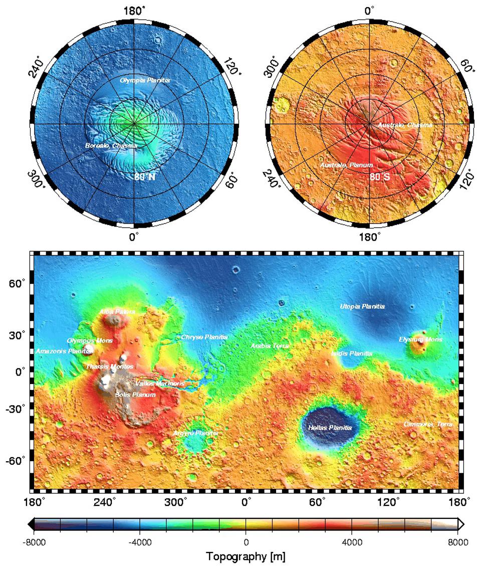 But another spectacular feature of Mars is its heavily cratered outer layer, with dramatic highlands and lowlands. Although there are a number of prominent features like mountains, volcanoes, basins, and multiple layers of craters, perhaps the most dramatic difference can be seen between the northern and southern hemispheres of the red planet. While there are topographical variations across both hemispheres, there is an enormous basin covering half of the planet, where for some reason, roughly 50 percent of Mars is around five kilometers (three miles) lower in elevation than the rest of the planet.