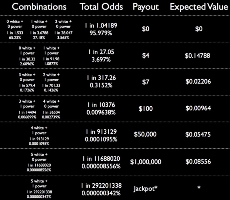 - But that probability doesn’t factor in the cost of a ticket versus how much you can expect to actually take home: the mathematical definition of “expectation value.”