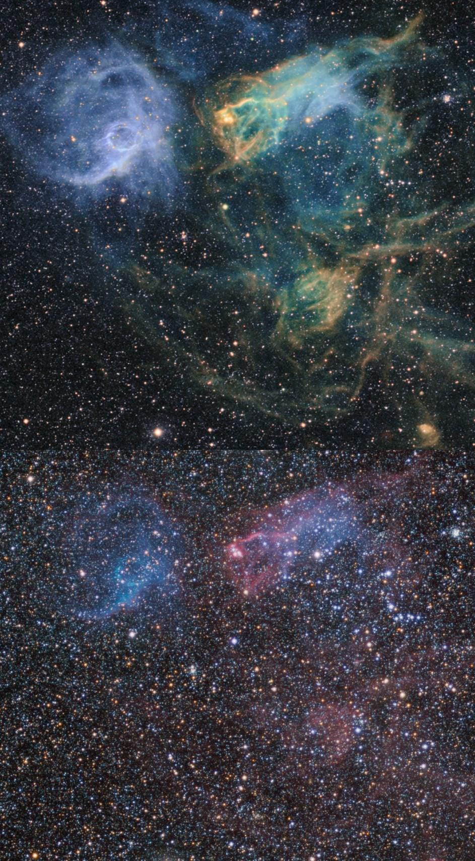 Even far away from the main plane of the galaxy, where the greatest numbers of stars are located, the element filters (top) and the RGB colors (bottom) still reveal gas, dust, reflection and emission features, as well as a variety of elements present. The LMC is one of the most actively star-forming galaxies in the nearby Universe, and regions such as this put that star-formation on display. (Credit: Ciel Austral: J.-C. Cannone, P. Berhnard, D. Chaplain, N. Outters & L. Bourgon)