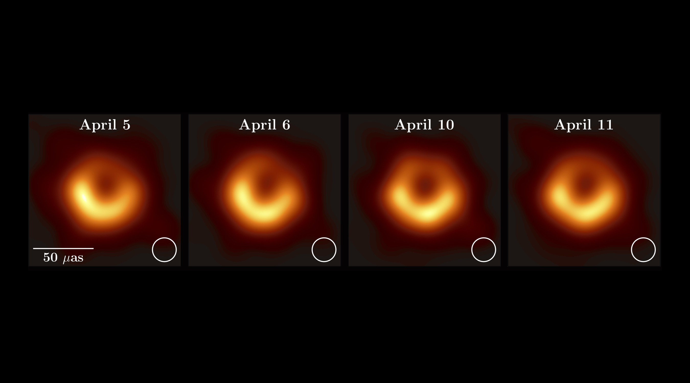 If you make good observations over short periods of time, and “short” must be relative compared to the timescales over which the black hole’s radiation pattern changes, you can produce a single image of the black hole’s event horizon. For Messier 87’s central black hole, you can see that the two images that are a day apart, each, look less different from one another than the images that are separated by nearly a week.