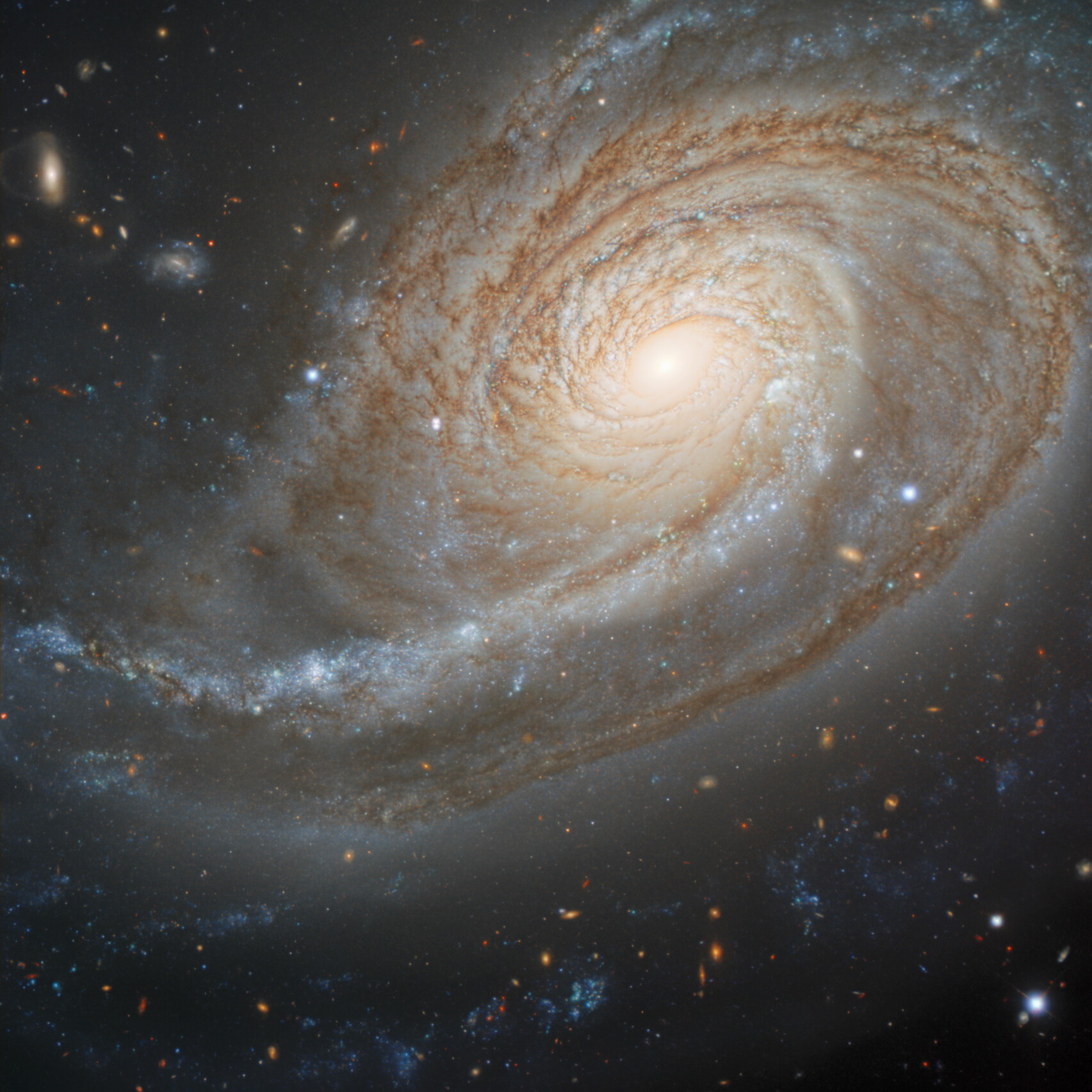 The enormous bar at the core of galaxy NGC 1300 spans many tens of thousands of light-years, nearly the full width of the galaxy. While many spiral galaxies contain large, prominent bars such as this one, our Milky Way’s central bar is far more modest, extending only about a third of the way out to the Sun’s position. The pink regions found along the spiral arms are evidence of new star formation, triggered by the interaction of internal gas and the density waves of the internal structure.