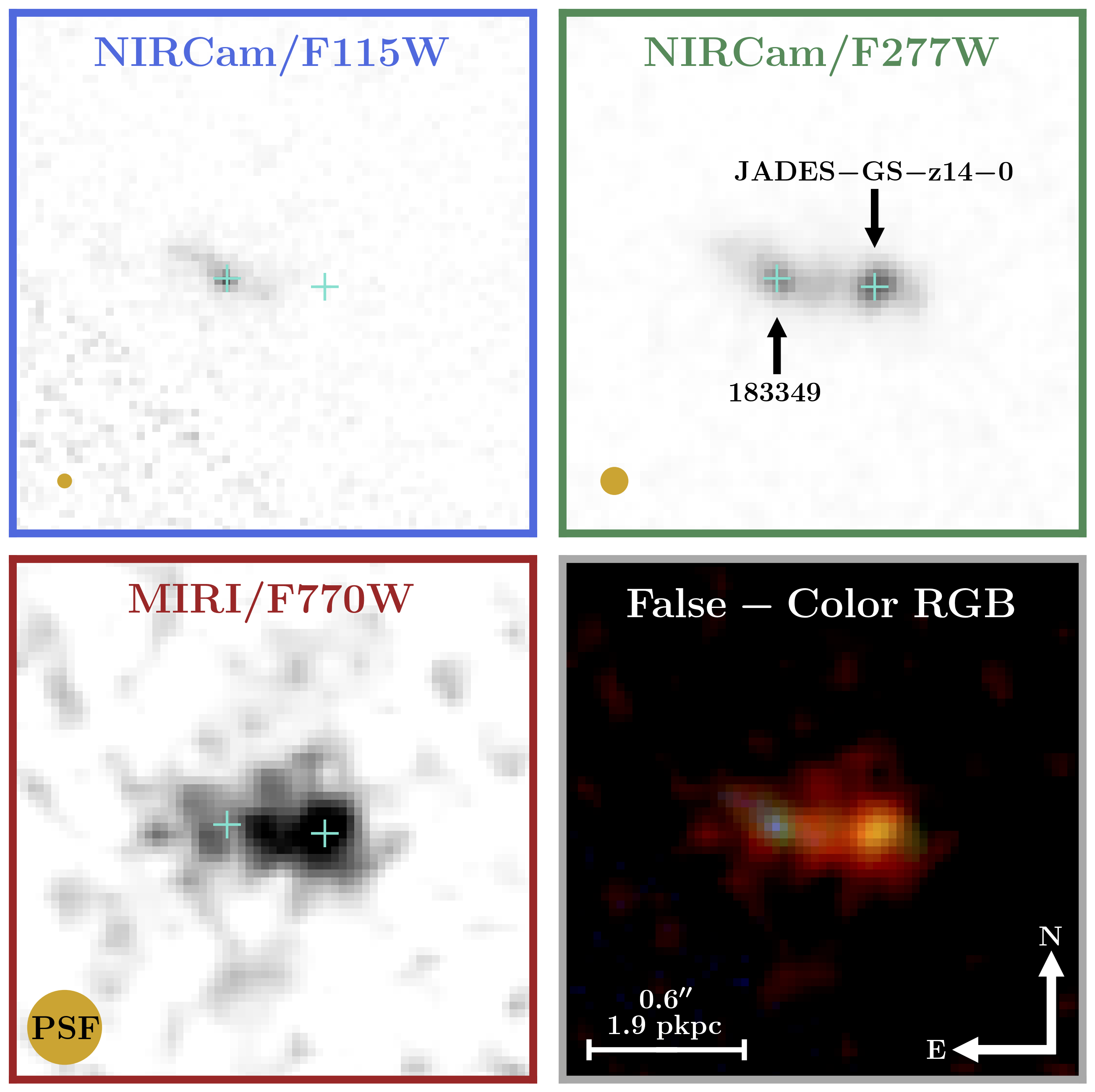This four-panel spread shows four different views of galaxy JADES-GS-z14-0 with photometric MIRI data. The fact that this galaxy has so much emission at 7.7 microns, photometrically, suggests (but does not prove on its own) that neutral, heated hydrogen (Balmer beta) and doubly ionized oxygen are both present in great abundances.
