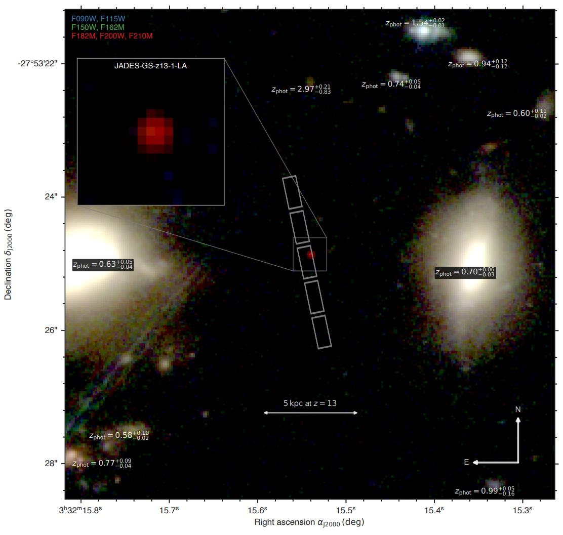 In between the two large, prominent foreground galaxies shown here, JWST has imaged a faint red object that was originally identified as an ultra-distant galaxy candidate: JADES-GS-z13-1-LA. After a spectroscopic study was performed, this galaxy has been confirmed to be at a redshift of between z=13.01 and z=13.05, placing its age as coming from when the Universe was only between 325 and 330 million years old. It is already massive, evolved in heavy elements, and bright.