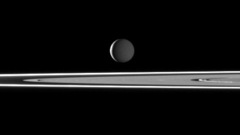 Out beyond Saturn’s main rings lies the brightest, most reflective moon in our Solar System: Enceladus. With a surface made almost entirely of snow and water-ice, Enceladus’ most prominent features are its geysers, which not only can eject plumes many hundreds of miles above the moon’s surface, but which create the entirety of Saturn’s E-ring, the prominent, diffuse ring just beyond the main ones.